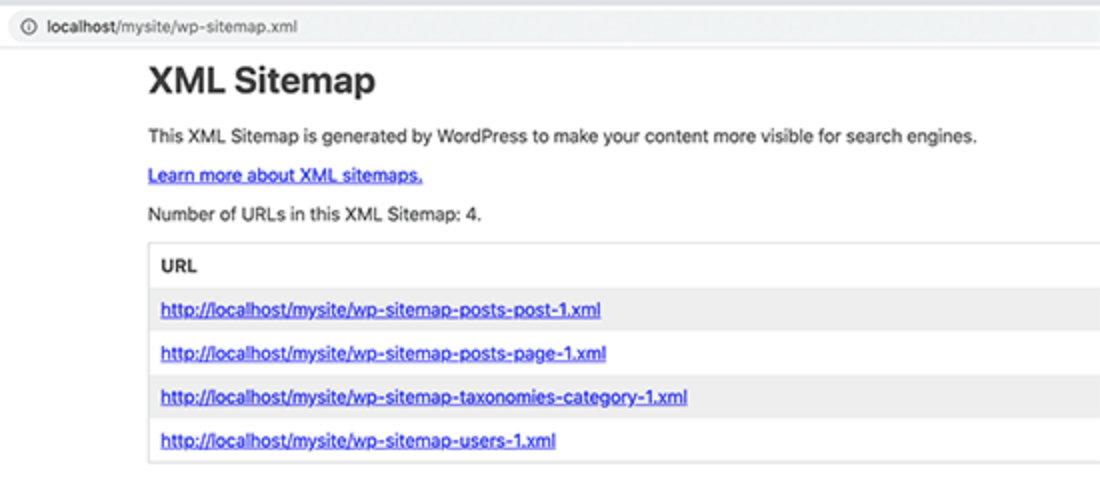Diese Methode ist sehr einfach und hinsichtlich der Funktionen begrenzt. In WordPress 5.5 wurden grundlegende XML-Sitemap-Funktionen veröffentlicht, die es Ihnen ermöglichen, automatisch eine XML-Sitemap in WordPress zu erstellen, ohne ein Plugin zu verwenden. Diese Sitemap umfasst Seiten, Beiträge und benutzerdefinierte Beitragstypen und stellt so sicher, dass Suchmaschinen Ihre Website problemlos indizieren können.