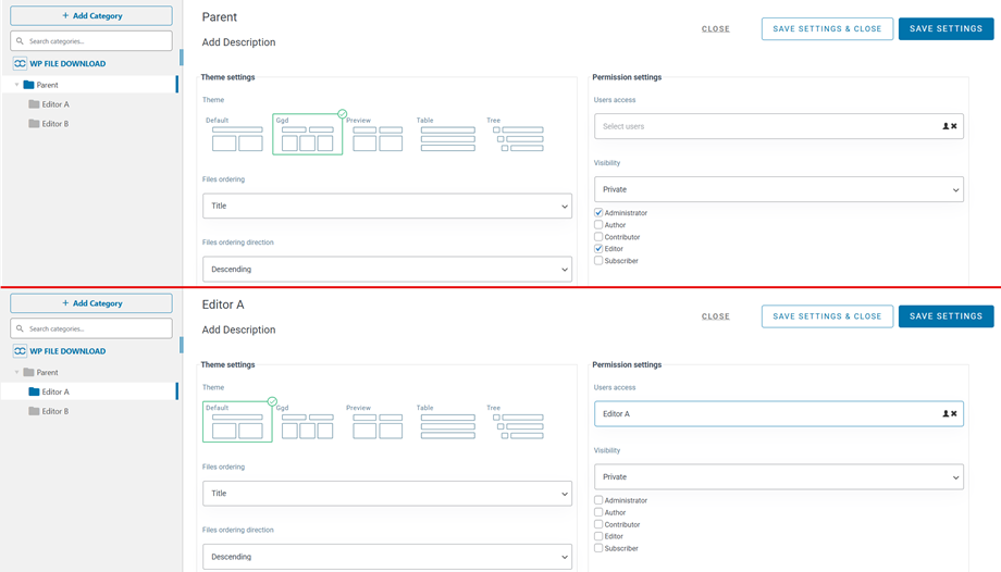 Mit WP File Download können Sie die Sichtbarkeit von Dateikategorien nach WordPress-Benutzergruppen einschränken. Öffnen Sie eine Dateikategorie und legen Sie fest, ob sie für eine Benutzergruppe oder einen einzelnen Benutzer sichtbar ist. Klicken Sie anschließend auf „ Einstellungen speichern“. Fertig!