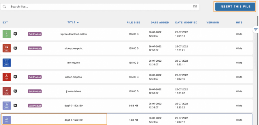 Ahora que estamos en la categoría, seleccionemos el archivo que queremos agregar al producto y, finalmente, haga clic en Insertar este archivo .