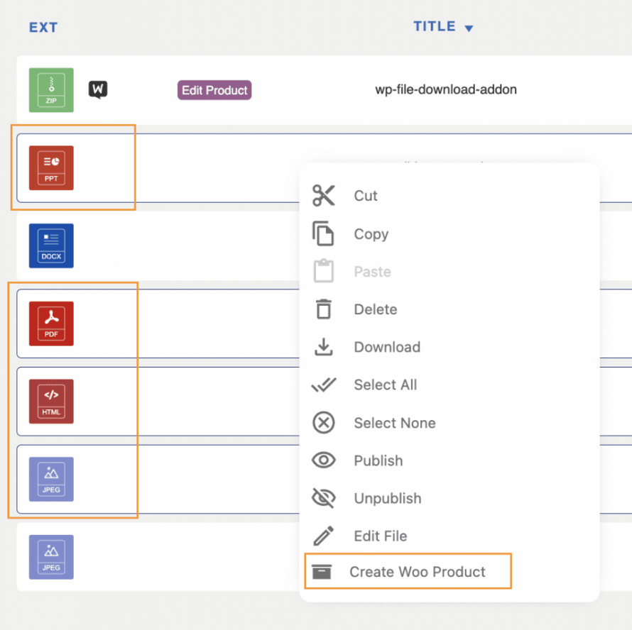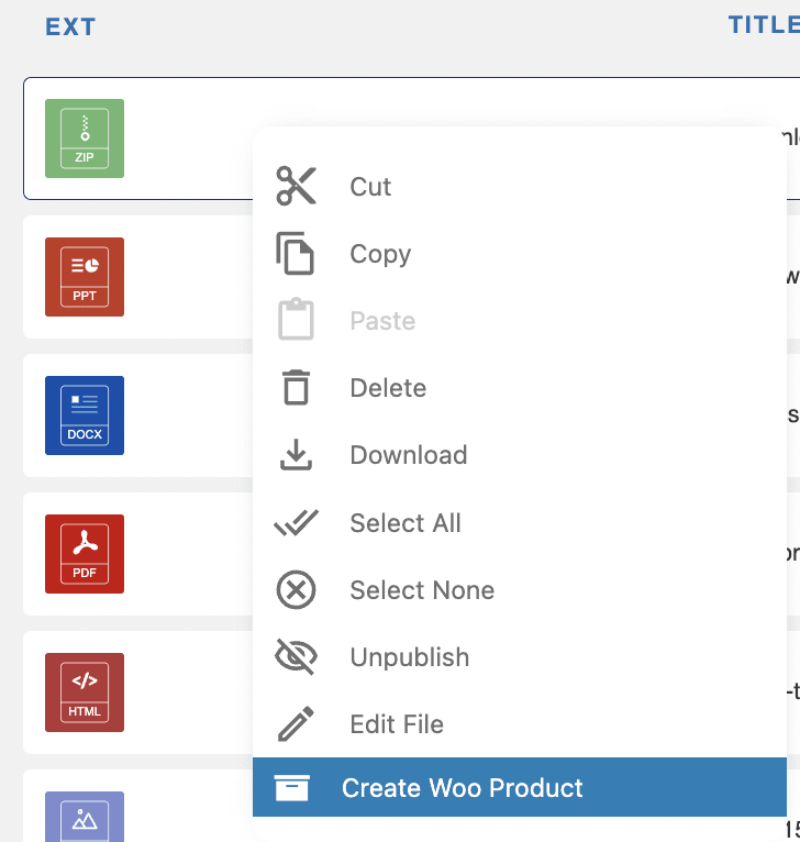 Ahora que cargamos los archivos, creemos el producto descargable, para esto, todo lo que necesita hacer es hacer clic derecho en el archivo que desea convertir y luego, seleccione Crear producto Woo .