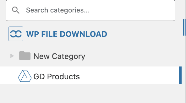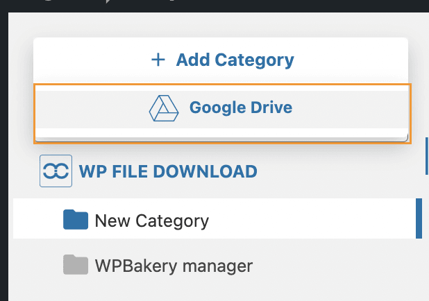 Ahora que el complemento está conectado a Google Drive, creemos nuestro producto descargable, para esto, vaya a WP File Download > WP File Download para abrir el panel de archivos y desplace el cursor sobre + Agregar categoría para que aparezca la opción Google Drive