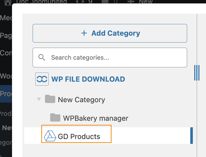 Para agregar archivos, hagamos clic en Agregar archivo , esto cargará una ventana emergente con el WP File Download donde podremos ver todas las categorías disponibles (incluidas las de Google Drive).