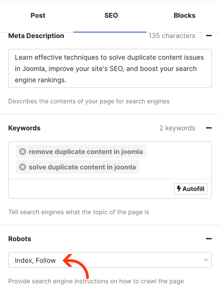Puede realizar este método simplemente cambiando el campo Robots a " Sin índice ". Si tiene dos artículos idénticos y le indica a Google que no indexe uno de ellos , los robots de búsqueda tendrán que indexar los demás .