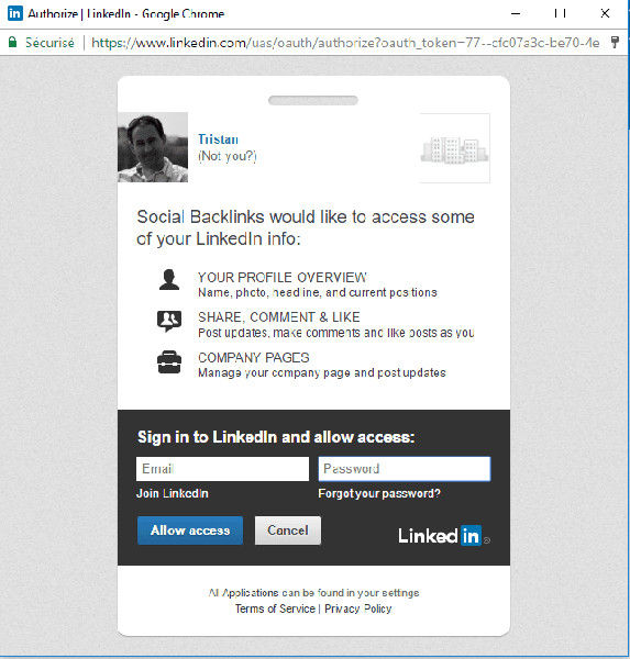 Validez ensuite l'avertissement et vous serez redirigé vers une page de connexion LinkedIn. Connectez-vous avec votre compte habituel.