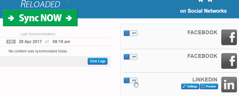 Nous avons créé une application LinkedIn dédiée pour vous aider à publier facilement sur les réseaux sociaux. Dans Social Backlinks cliquez sur le bouton LinkedIn Off/On.