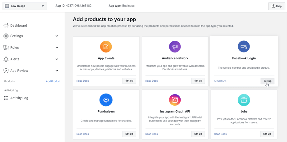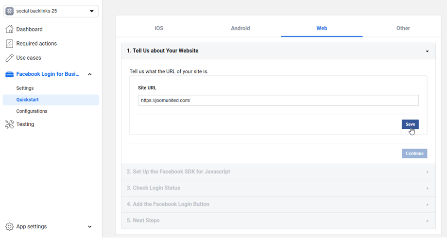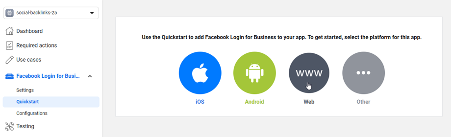 Après cela, accédez à Facebook Connexion pour les affaires> QuickStart , sélectionnez un Web de plate-forme.