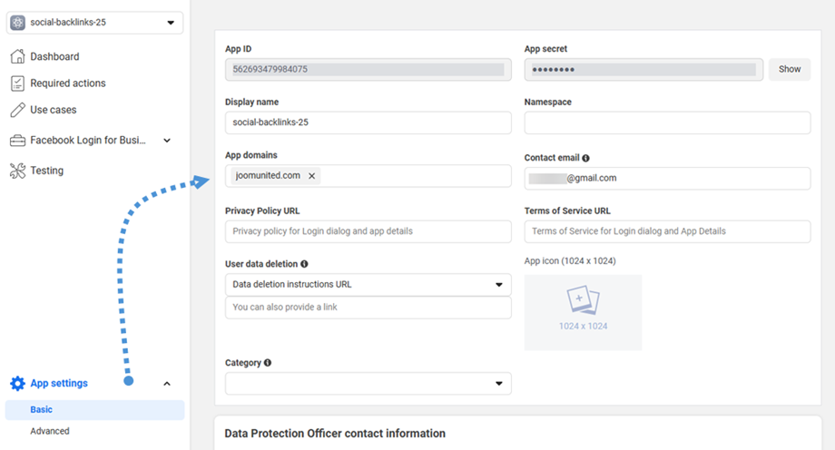 Allez dans Paramètres de l'application> Basic dans le menu de gauche, puis remplissez les domaines de l'application avec le domaine de votre site Web (pas de https: // www) et URL (avec https: // www)