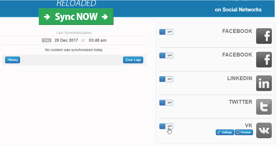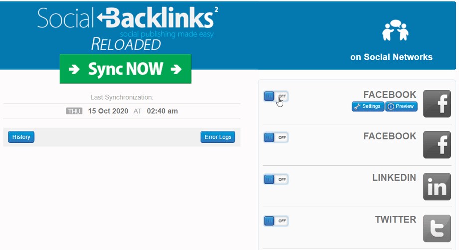 Nous avons créé une application Facebook dédiée pour vous aider à publier facilement sur les réseaux sociaux. Dans Social Backlinks cliquez sur le bouton Off/On.