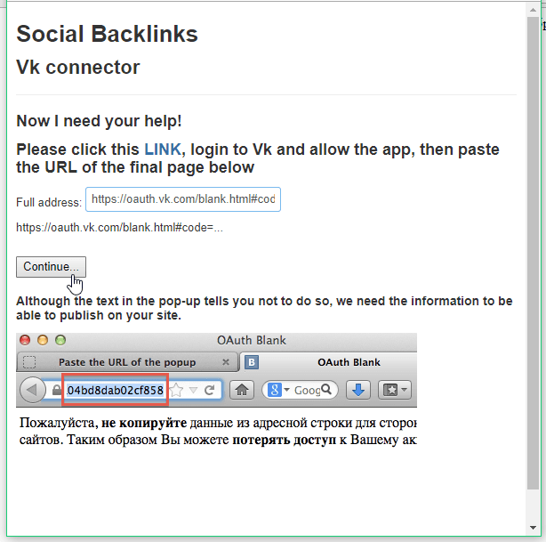 Une fenêtre pop-up apparaît, vous cliquez sur le LIEN , il sera basculé vers un nouvel onglet, puis copiez l'URL (par exemple: https://oauth.vk.com/blank.html#code=a250ef9427c3925) et collez-la à l' adresse complète domaine. Ensuite, appuyez sur le bouton Continuer .