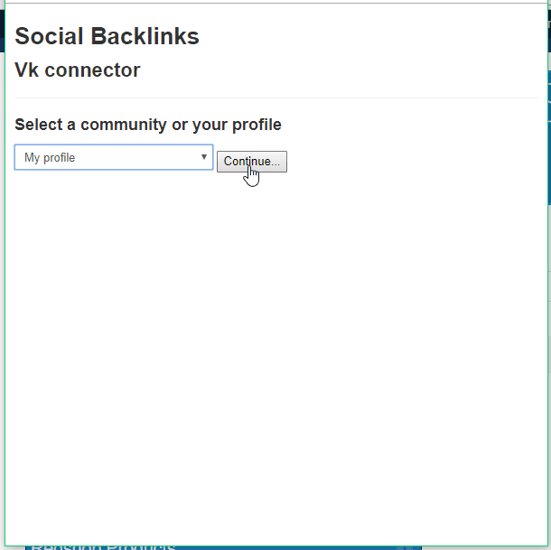 Vous pouvez choisir Communauté ou votre profil dans votre compte VK, puis cliquez sur le bouton Continuer .