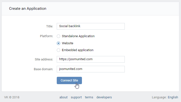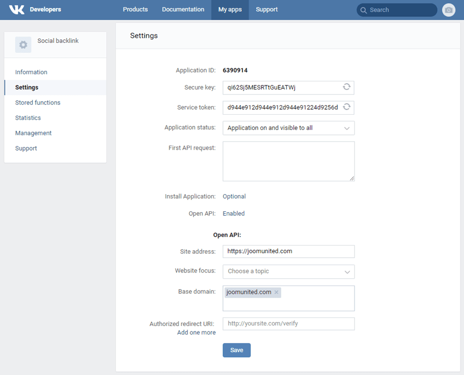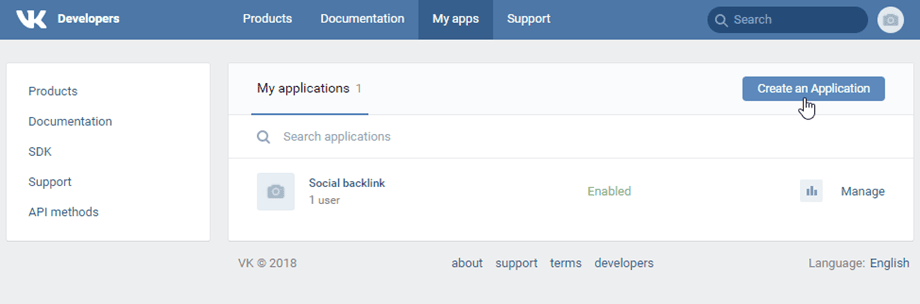 Vous pouvez également connecter un compte VK à l'aide de votre propre application. Tout d'abord, vous devez créer une application VK ici : https://vk.com/apps?act=manage