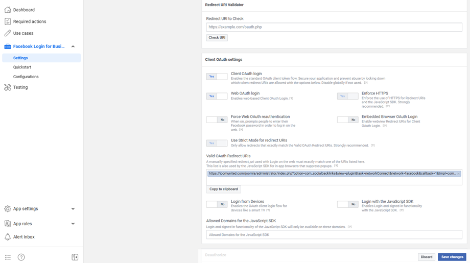 Ensuite, passez à Paramètres> Paramètre Client OAuth , saisissez votre URL sur URIC de redirection Valid OAuth . Avec le 1er compte Facebook, vos URL de redirection doivent être: https://your-domain.com/administrator/index.php?option=com_socialbacklinks&view=plugin&task=networkconnect&network=facebook&callback=1&tmpl=component