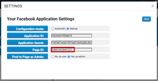 Ces deux champs ci-dessous doivent être remplis afin de publier sur votre compte Facebook. Collez l'ID d'application et le secret d'application, puis suivez l'étape suivante pour connecter votre page Facebook.