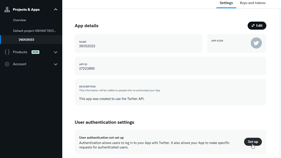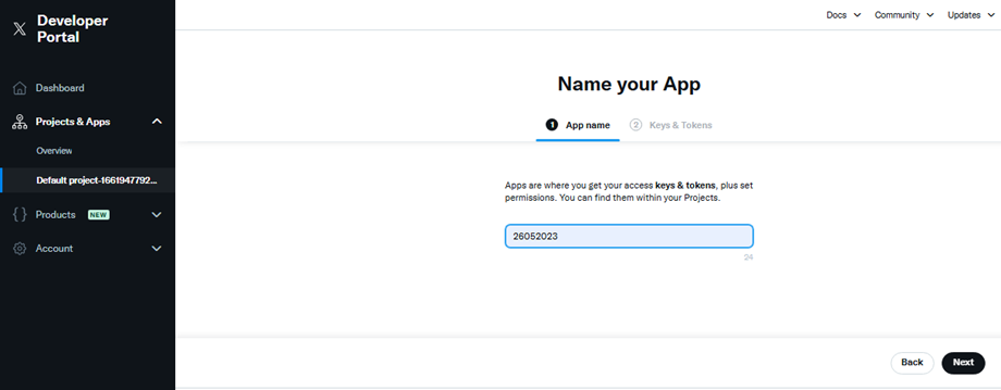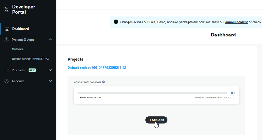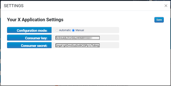 Vous pouvez connecter un compte X en utilisant votre propre application. Tout d'abord, vous devez créer une application X ici : https://developer.x.com/en/portal/dashboard