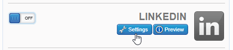 Vous devez remplir 2 champs dans la configuration LinkedIn des Social Backlinks pour être connecté. Placez d'abord votre souris sur le bloc LinkedIn, à droite de votre écran puis cliquez sur le bouton «Paramètres».