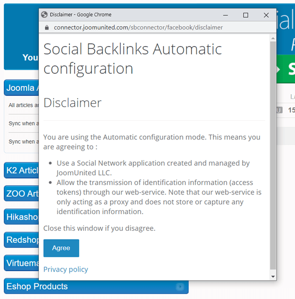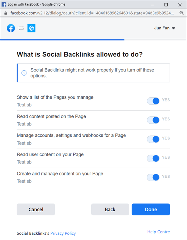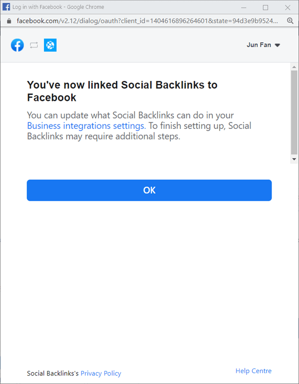 Vous avez maintenant lié Social Backlinks à Facebook. Cliquez sur le bouton OK.