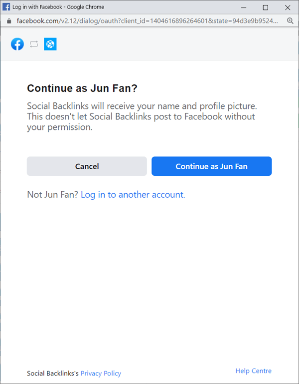 Ensuite, vous devez vous connecter à votre compte Facebook pour publier sur une page. Cliquez sur le bouton Continuer en tant que....