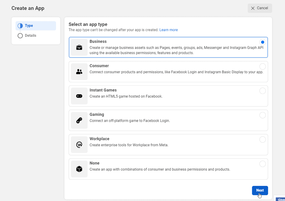 - Sélectionnez l'option Web App, Automated App ou Bot