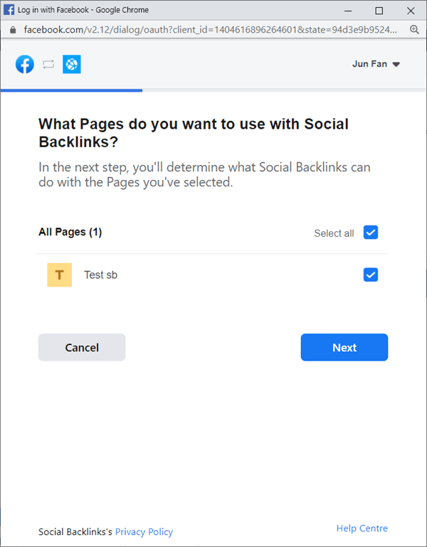 Sélectionnez ensuite la page Facebook sur laquelle vous souhaitez publier. Cliquez sur le bouton Suivant.