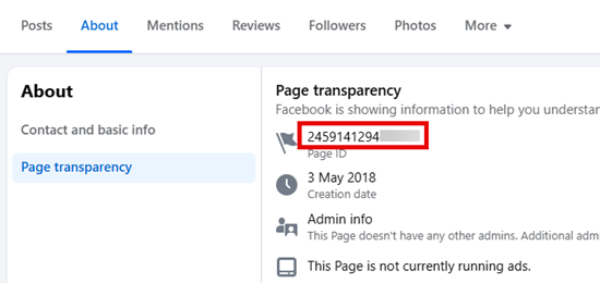 B. Obtenez votre ID de page à environ> la transparence de la page .