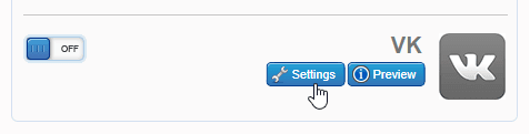 Vous pouvez maintenant copier App ID et App Secret dans la configuration VK des Social Backlinks afin d'être connecté. Placez d'abord votre souris sur le bloc VK, à droite de votre écran puis cliquez sur le bouton « Paramètres ».