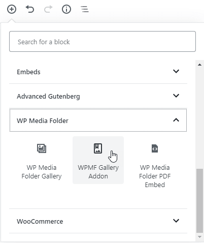L'autre façon de publier votre galerie est d'ajouter le bloc « WP Media Gallery », il suffit de cliquer sur + > WP Media Folder > WP Media Folder Gallery.