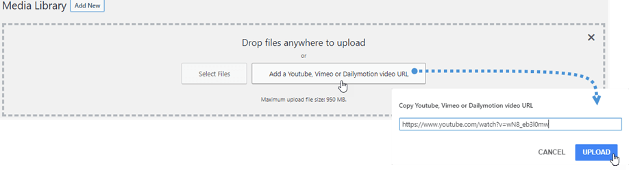 En haut, une fois que la médiathèque est un bouton appelé "Ajouter nouveau", cliquez dessus puis cliquez sur "Ajouter une URL de vidéo youtube, Vimeo ou Dailymotion", après quoi vous pourrez coller le lien et ajouter le vidéo et cliquez sur «Télécharger».