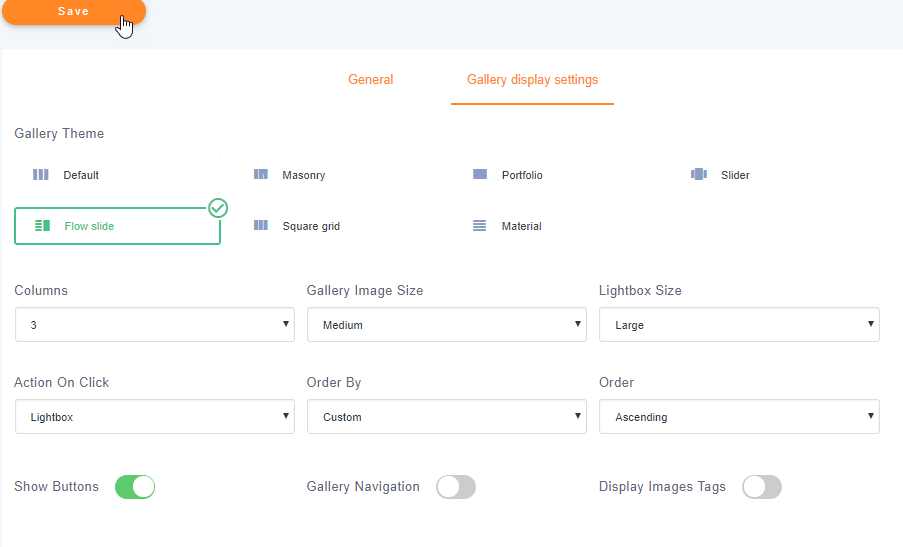Vérifiez que nous pouvons également télécharger des images sur ce tableau de bord à partir de wordpress et de votre ordinateur, dans l'autre section "Paramètres d'affichage de la galerie", nous pouvons définir le reste des paramètres, nous pouvons également changer le thème, configurez-le et cliquez sur "Enregistrer" ".