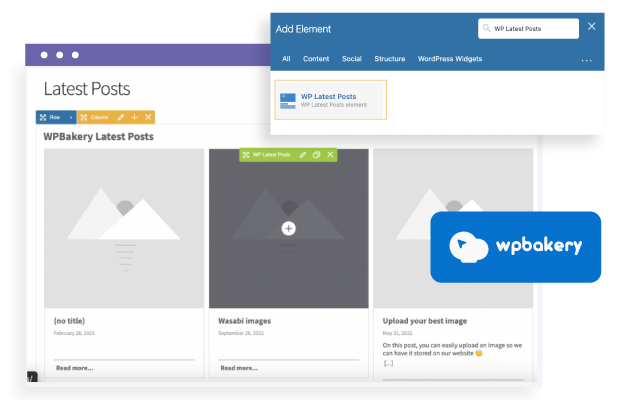 WP Latest Posts fournit un élément de constructeur de contenu dédié pour WPBakery, vous permettant d'ajouter facilement des articles récents, des pages ou des types d'articles personnalisés avec des options de formatage avancées directement dans l'interface WPBakery.