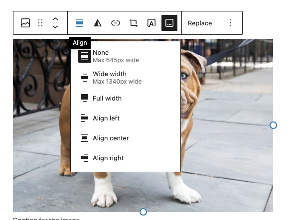 Klik gambar di editor, lalu gunakan bilah alat untuk menyelaraskan atau mengedit (misalnya, sebaris, lebar, atau lebar penuh).