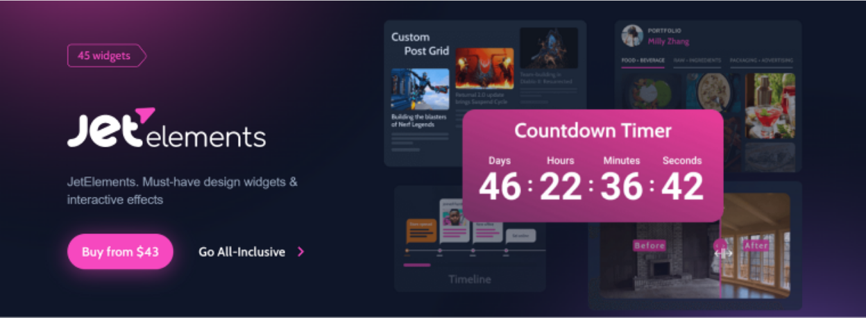 Plugin portofolio berikutnya untuk website WordPress berisi 46 widget. JetElements memungkinkan Anda membuat portofolio yang cerah dan interaktif serta mengedit semua isinya, termasuk font, gambar, warna latar belakang, penempatan gambar, efek visual, tombol, dan banyak lagi. Anda dapat membuat galeri hanya dengan drag-and-drop, sehingga Anda langsung melihat hasilnya.