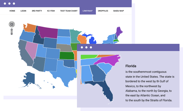 Linky Map menggunakan pustaka Google Geochart untuk menghasilkan peta vektor yang menjamin data lokasi yang lengkap dan terkini. Dengan Linky Map Anda dapat membuat peta vektor dengan warna kustom berdasarkan wilayah. Semua negara termasuk! Selanjutnya, Anda dapat menentukan beberapa elemen desain tambahan: