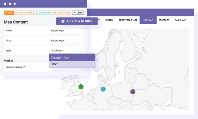Linky Map menawarkan berbagai opsi tata letak seperti peta lebar penuh, kotak, atau tertanam, plus tema yang dapat disesuaikan dan pengaturan gaya untuk mencocokkan desain situs Joomla Anda.