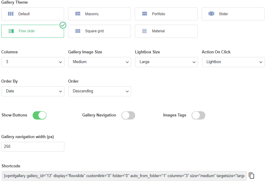 In questa schermata, possiamo impostare tutte le cose relative alla galleria, puoi scegliere il tema, impostare le colonne, la dimensione di tutti gli elementi della galleria, l'ordine e le impostazioni di navigazione, tutto in un'interfaccia davvero facile da usare .