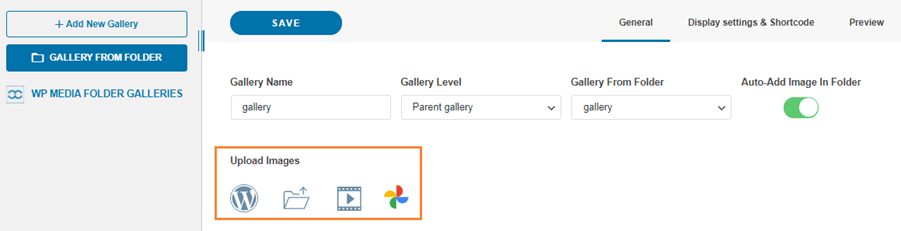 Ora che lo hai installato, vai su Media > Gallerie di cartelle multimediali , in questa schermata vedrai la dashboard del componente aggiuntivo per la gestione della galleria con le opzioni per selezionare le immagini dal tuo PC, WordPress e Google Foto .