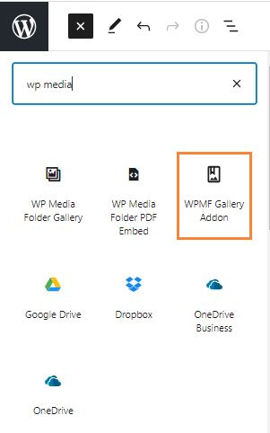 Quindi ora possiamo andare al post/pagina e modificarlo o crearne uno nuovo se lo desideri, quindi andare ad aggiungere un blocco, in questo caso utilizziamo l'editor Gutenberg facendo clic su + > Componente aggiuntivo WPMF Gallery.