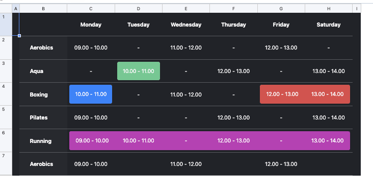 Con questa tabella, possiamo creare un programma con attività o anche un calendario degli appuntamenti per tenere traccia delle attività settimanali da svolgere o, ad esempio, se abbiamo eventi settimanali.