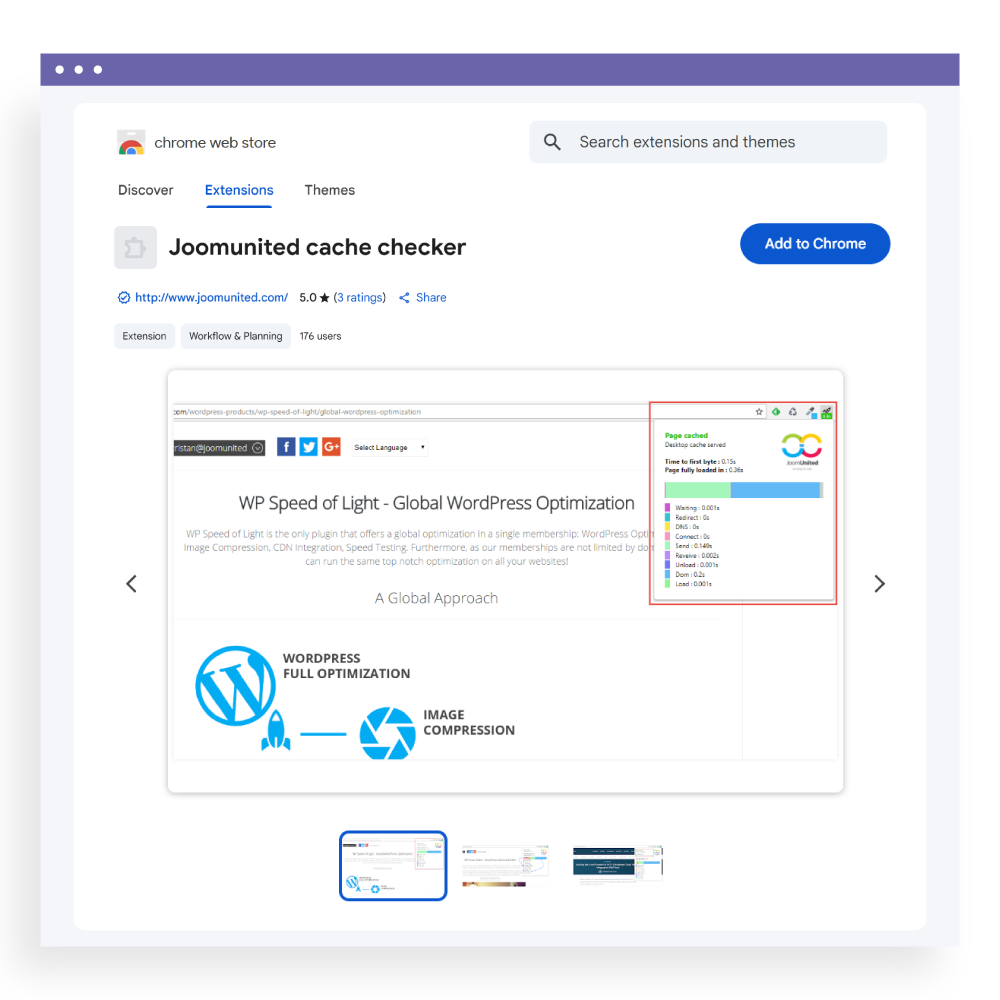 캐시가 WP Speed of Light를 사용하여 제공된 경우 녹색 기호가 표시되고, 그렇지 않으면 회색으로 표시됩니다. 간단합니다! 또한 데스크톱, 태블릿 또는 모바일 캐시가 제공되는지 확인할 수 있습니다. JoomUnited 캐시 검사기는 일반적인 정보(모든 웹사이트에 적용됨)도 표시합니다