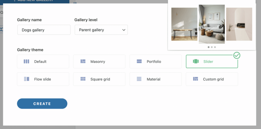 W tym przypadku użyjemy galerii Slider, a nazwa galerii to Galeria psów , po wykonaniu tej czynności wystarczy kliknąć „Utwórz”.