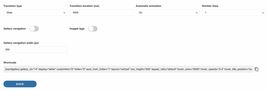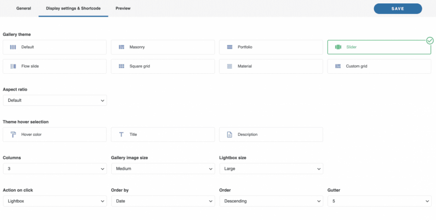 Ustawienia wyświetlania i krótki kod : W tej sekcji możemy zarządzać wszystkimi ustawieniami związanymi z układem galerii, możemy zdefiniować motyw, skopiować krótki kod, marginesy, rozmiar obrazu, współczynnik proporcji, liczbę kolumn, akcję po kliknięciu, kolejność, i jeśli chcemy nawigacji po galerii i wielu innych ustawień.