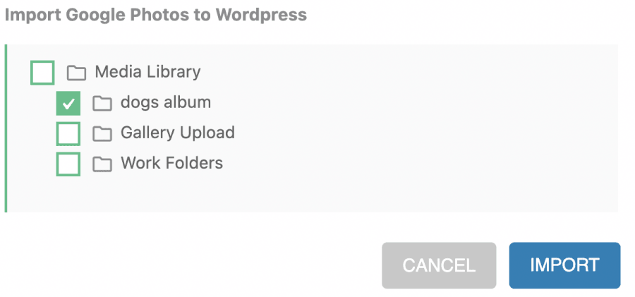 Kliknięcie dowolnej opcji importu spowoduje otwarcie wyskakującego okienka z naszymi folderami dostępnymi w bibliotece multimediów (utworzonej za pomocą WP Media Folder). Będziesz musiał wybrać folder, do którego chcesz go przesłać, lub po prostu pozostawić go w głównym „ Biblioteka multimediów”, jeśli nie chcesz importować zaznaczenia lub albumu do określonego folderu :)