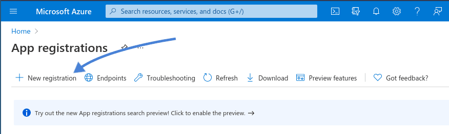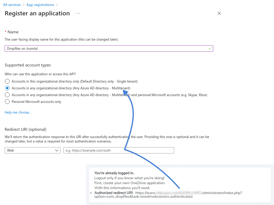 Na stronie głównej kliknij „Nowa rejestracja” . W wyświetlonym formularzu należy wprowadzić trzy ważne parametry. Najpierw wybierz nazwę aplikacji. Następnie ustaw obsługiwane typy kont na „Konta” w dowolnym katalogu organizacji (dowolny katalog Azure AD – Multitenant) . Następnie wprowadź adres URI przekierowania , który można uzyskać z Dropfiles .