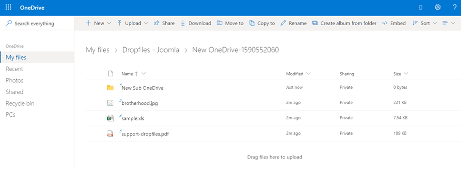 Jeśli wykonałeś/aś instrukcje, OneDrive dla Firm z Joomla! zostało nawiązane. Gdy tylko kliknąłeś/aś Połącz OneDrive dla Firm , Dropfiles utworzył/a folder w katalogu głównym Twojego OneDrive . W tym nowym katalogu będą przechowywane wszystkie zsynchronizowane pliki i multimedia Dropfiles