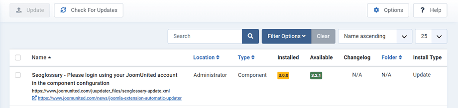 Actualizatorul automat, care împinge notificarea de actualizare, este încorporat în extensia Joomla pe care ați instalat-o. Astfel, veți primi notificări ca orice altă extensie din tabloul de bord sau folosind meniul: Sistem > Actualizare > Extensii.