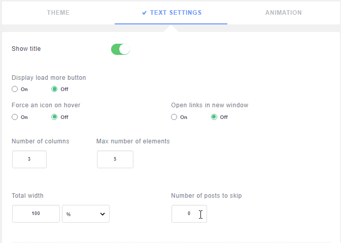 ใน ส่วนการตั้งค่าข้อความ คุณสามารถเลือกตัวกรองอื่น ๆ ที่สามารถช่วยได้ เช่น ตัวเลือกในการข้ามโพสต์จำนวนหนึ่ง จำนวนคอลัมน์ (ขึ้นอยู่กับธีม) และจำนวนองค์ประกอบสูงสุด (ตัวเลือกนี้จะกำหนดโพสต์ทั้งหมดที่มี อินสแตนซ์จะแสดง)