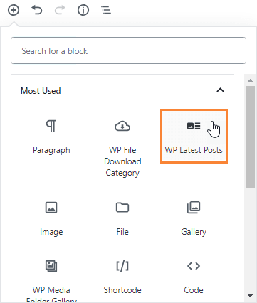 ไปที่ เมนูโพสต์ล่าสุด WP และคลิกที่ + บล็อกใหม่