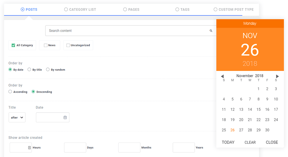 ใน เวอร์ชัน Pro คุณจะสามารถเลือกตัวกรองวันที่ได้ ในกรณีนี้ คุณจะสามารถเลือกกลุ่มบทความที่โพสต์จากวันที่หนึ่งเป็นวันที่อื่นได้ (เช่น มกราคม 2019 ถึง มีนาคม 2019)
