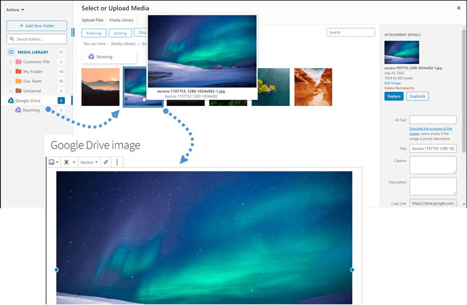 การรวม Google Drive ของ WP Media Folder ช่วยให้คุณดำเนินการกับสื่อของคุณได้ 2 ประเภท: