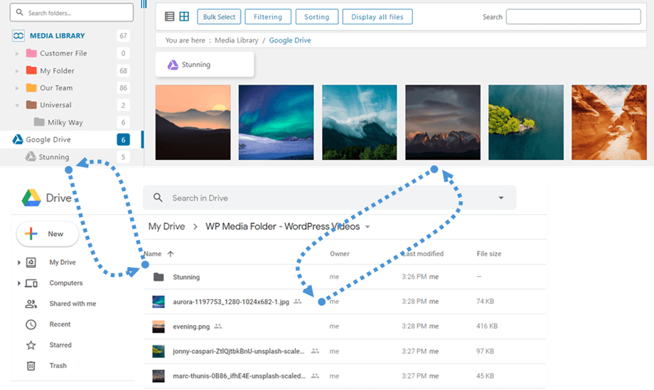 โฟลเดอร์และโฟลเดอร์ย่อยทั้งหมดที่เพิ่มใน WP Media Folder Google Drive จะถูกซิงโครไนซ์ภายใต้โฟลเดอร์นี้ ( WP Media Folder - {sitename}) และในทางกลับกัน สื่อทั้งหมดของคุณจาก โฟลเดอร์รูท บน Google Drive จะถูกซิงโครไนซ์กับไลบรารีสื่อของคุณบน Wordpress