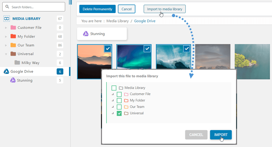 ตัวเลือกแรกคือ การนำเข้าสื่อ Google Drive ใน WP Media Folder (การเลือกโฟลเดอร์สำหรับการนำเข้า)